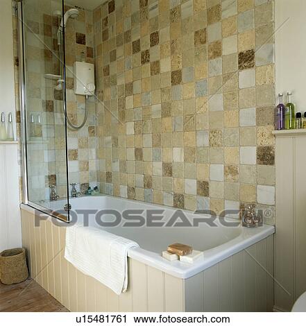 Electric Shower Above Bath In Peach Tiled Bathroom Stock